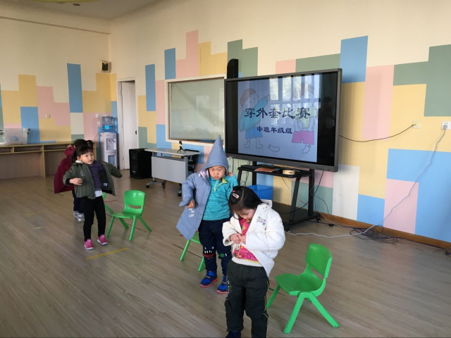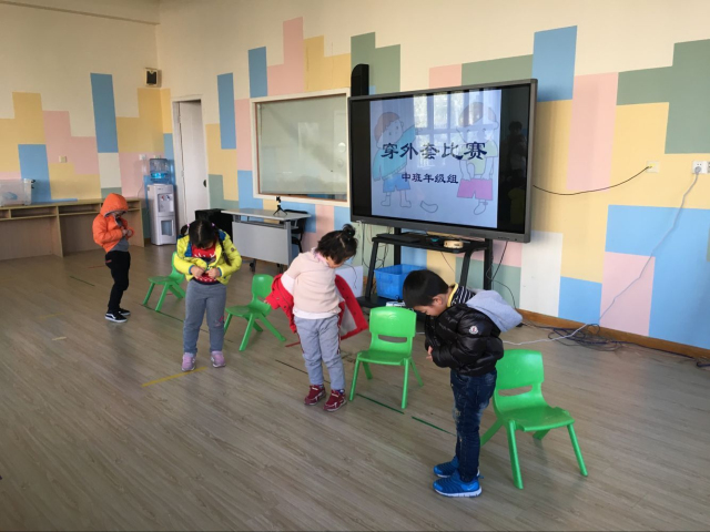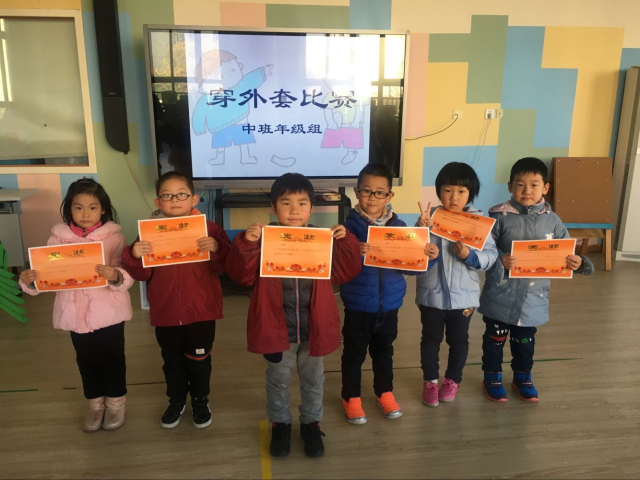 每班通过班级预选选出的6名小选手正自信满满地等待着比赛。当“比赛开始”信号响起的一刹那,他们舞动着灵巧的双手,迅速地穿外套。虽然他们各自用的方法不同,但穿外套的速度却都很惊人。一旁观赛的小伙伴们纷纷为他们鼓掌、加油。最后经过6轮激烈比拼,我们评出了“自理小能手”并颁发了奖状。
