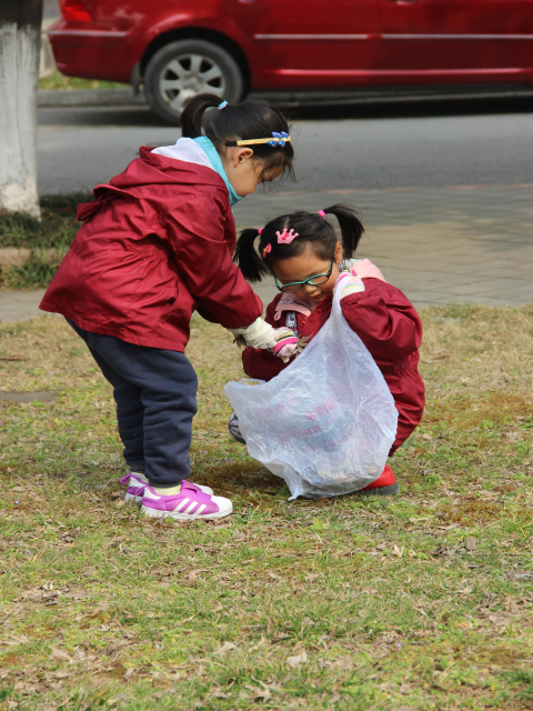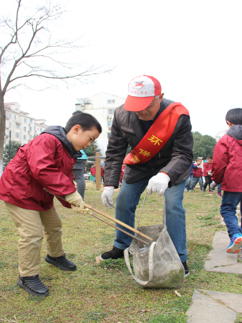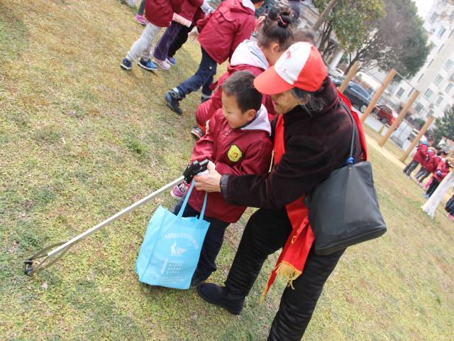 讲完雷锋的故事,杨老先生带着孩子走进社区,用最简单的捡拾垃圾的方式,给孩子们上了一节生动的环保宣传课。在街边、公园的草丛里,杨老先生手把手教会了小朋友们如何使用工具捡拾垃圾。