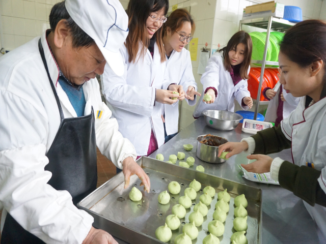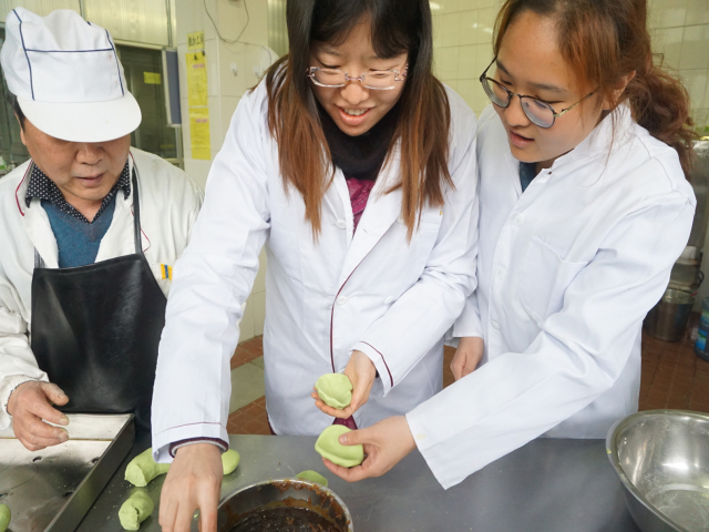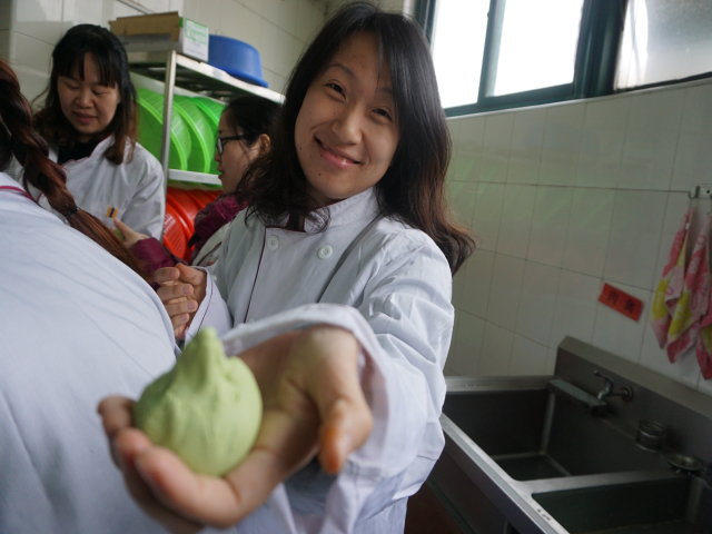 青团子作为苏州人必吃的清明节令食品之一,其制作工艺非常考究。作为80后的教师平时很少有机会自己动手制作这些传统小吃。在本次活动之前,她们先集中食堂,向食堂师傅取经,学习青团子的制作方法与过程,在食堂厨师的指导下,大家一起捣麦草汁、揉面团、包馅料、做青团。不一会儿,一个个圆滚滚的绿色团子在她们手中绽放。