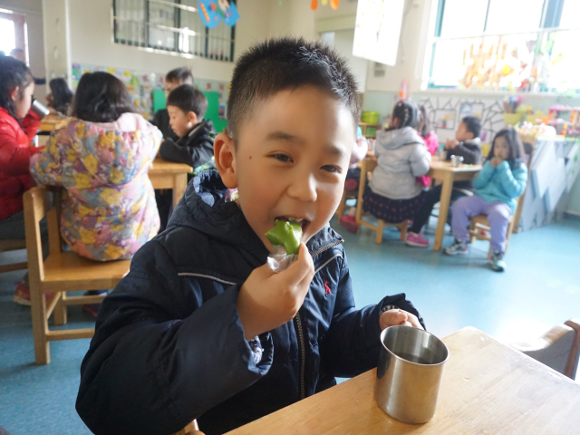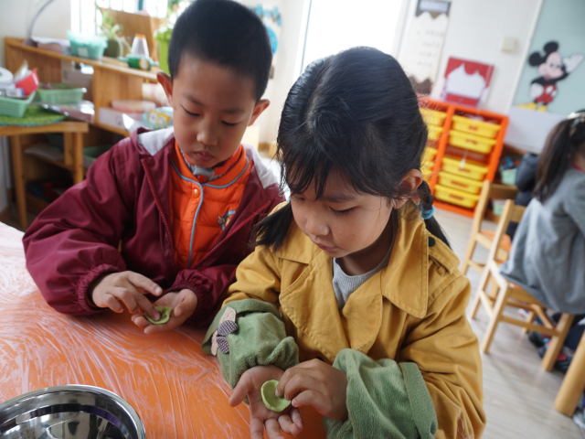 轮到孩子们制作时,他们有了老师的示范与指导,一个个挽起袖子,有条不紊地用自己的小手团啊团,搓啊搓,各种可爱的青团子就在孩子们的手下呈现了。当青团子蒸熟出笼时,浓浓的清香扑鼻而来。孩子们品尝着自己制作的青团,无论从色彩到口感,都让大家都感受到了春天的气味!
