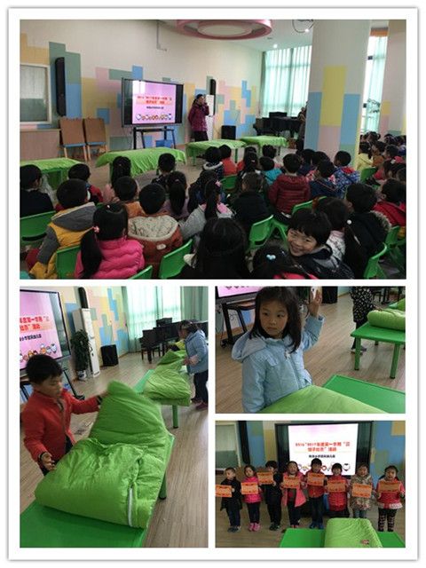 为了巩固幼儿的自我服务意识,提高生活自理能力,日前,新康小学附属幼儿园大班幼儿集中在多功能厅,举行了一次别开生面的叠被子比赛。