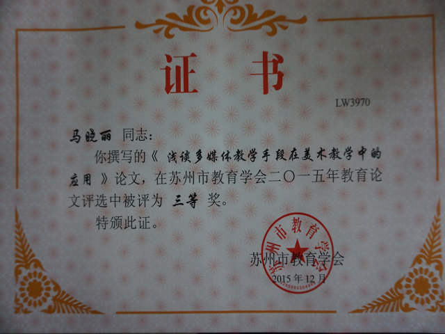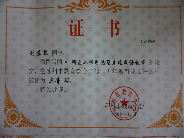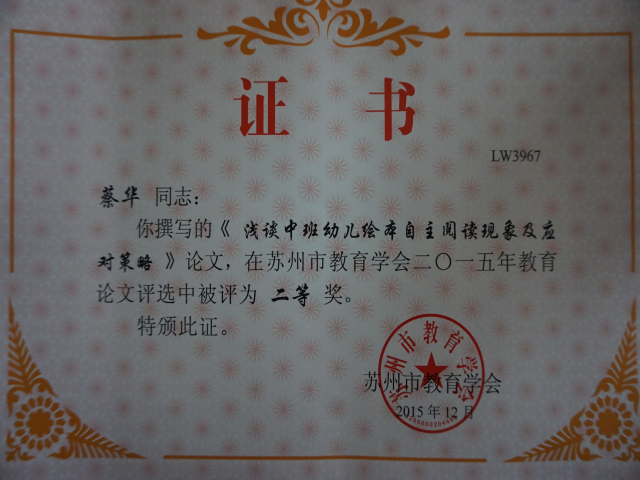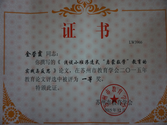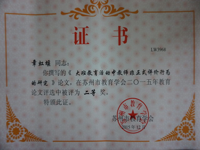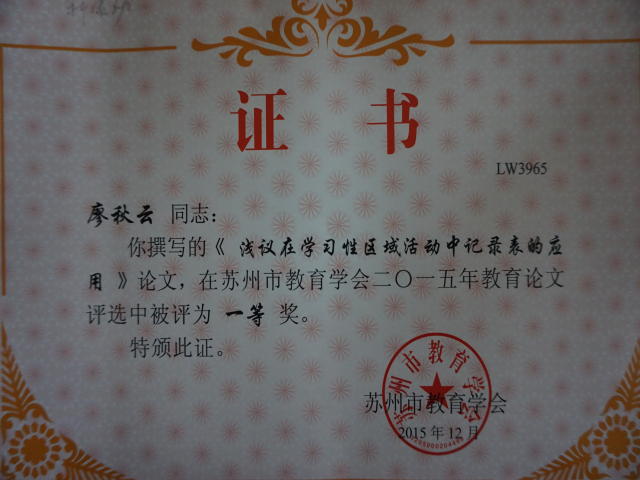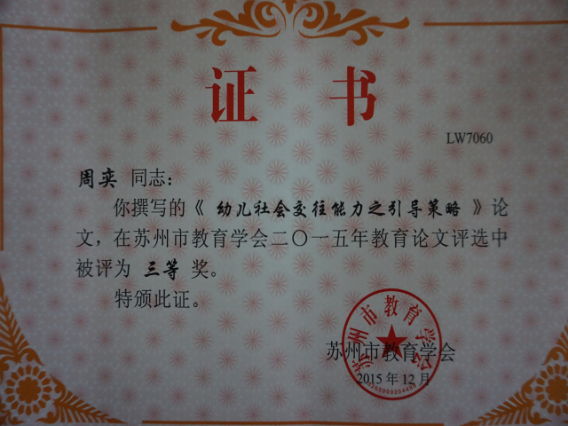 热烈祝贺我园周奕、廖秋云、金莹霞、蔡华、章虹堰、刘苏琴、马晓丽等多位教师在苏州市教育学会论文评比中获奖。