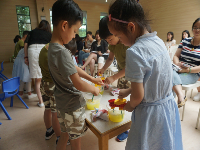 何晅园长与马晓丽老师在本次活动中分别执教大班数学活动《石头剪刀布》与大班综合活动《打蛋器》。何晅园长设计的大班数学活动以游戏“石头剪刀布”贯穿始末,让幼儿在游戏中感知数与量的关系,学习用语言和列式计算等方式来表达自己的游戏过程,体验数学活动的乐趣,突破自我,完成挑战。马晓丽老师设计的大班综合活动则以乐高建构为基础,让幼儿利用乐高配件建构打蛋器,在拼一拼、搭一搭、试一试的过程中感知齿轮的啮合以及齿轮啮合所带来的省力、方便之处。教学活动结束后,两位老师分别与现场听课教师进行互动、研讨,受到了听课教师的好评,也获得了进一步改进教学设计的启发。