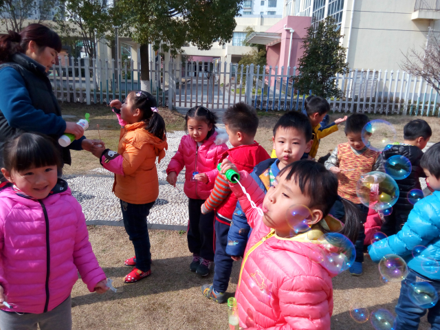 春天到了,小草慢慢绿了,花儿悄悄开了,小朋友也想展开双臂在春天里自由嬉戏。结合主题,中班年级组的孩子们在老师的带领下进行了一次户外《吹泡泡》的科学探究活动。