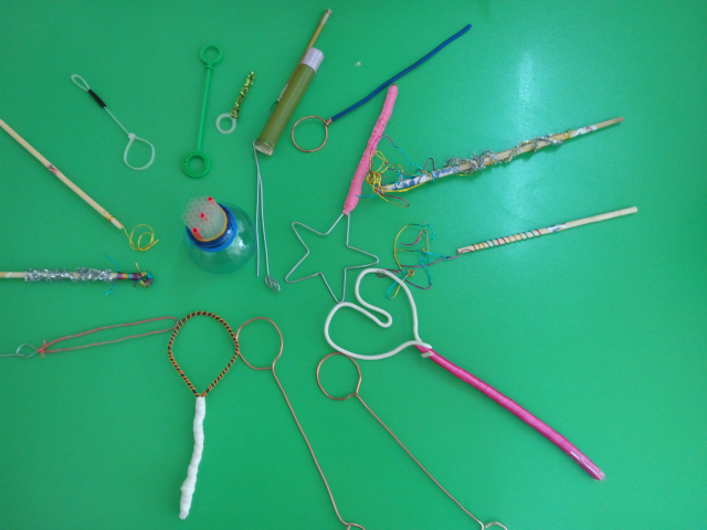 活动前在家长的协助下,孩子们带来了各种各样的吹泡泡神器,如圆形、椭圆形、三角形、螺旋形、小兔形、爱心形……你们看,真是丰富极了!还没有开始吹之前,老师先让孩子们猜想用不同形状的吹泡器吹出来的泡泡会是什么形状的,他们给出两个不同的答案,一是认为无论吹泡器是什么形状,吹出来的泡泡都应该是圆形的,理由是从来没有看到过其他形状的泡泡;而另一种认为泡泡的形状是根据吹泡器的形状来决定的。吹泡泡正式开始了,当他们自己进行实验验证时,一个个都屏住呼吸,生怕一眨眼看错了,看着他们一副认真的表情,真是让人忍俊不禁。
