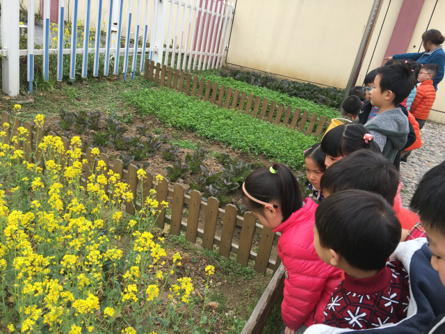 午后,孩子们最喜欢来这里散步,一起寻找春天。听,他们开始叽叽喳喳地询问各种问题:“老师,这是什么菜?为什么长这颜色?”“老师,这菜怎么和之前我们吃的不一样?”“老师,为什么这菜要长在大棚里,它是不是怕冷啊?”……孩子们的问题一个接一个,老师耐心的一个个回答:“这叫莴苣笋,上面长得是叶子,我们一般吃的部分是它的粗粗的茎……春天早晚会比较冷,这类蔬菜怕冷,所以要躲在暖房里,就像我们晚上睡觉要在房子里盖好被子一样……”
