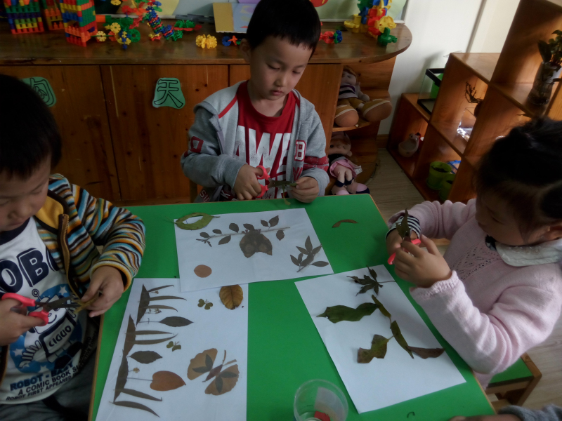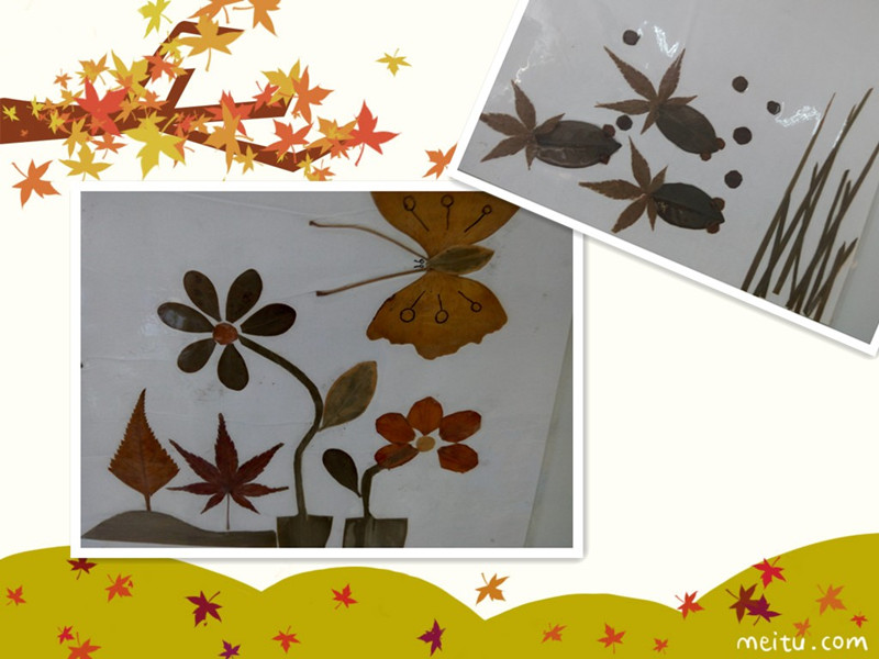 在老师的指导下,孩子们用树叶粘贴出了一幅幅美丽的图画。瞧!在他们灵巧的小手下:落叶“游”成了可爱的“小金鱼”,正在自由自在地的嬉戏;落叶“翻飞”成了灵活的“小蝴蝶”,还迷恋在生机勃勃的大自然中;落叶“凑成”了人见人爱的“小动物”,成群结队的鱼儿、五彩的蝴蝶……孩子们将手中的树叶通过拼制粘贴,制作出了一幅幅富有创意的树叶贴画,赋予了叶子新的生命力,生动形象地表现了孩子们心中的无限快乐和眼中多姿多彩的世界。