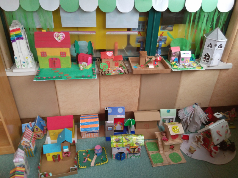 经过家长和孩子们的奇思妙想,冰棒棍、泡沫、废旧纸盒、报纸、废旧光盘等各种各样的废旧物品变成了各式各样温暖的家。有独立别墅房、有绿树庭院、还有温馨优雅的亭台楼阁……每幢房子都体现出每个家庭的精心创意和精巧的手工制作。当老师问起幼儿自己的作品时,他们争先恐后、滔滔不绝地讲述着和爸爸妈妈一起制作房子时的快乐场景。