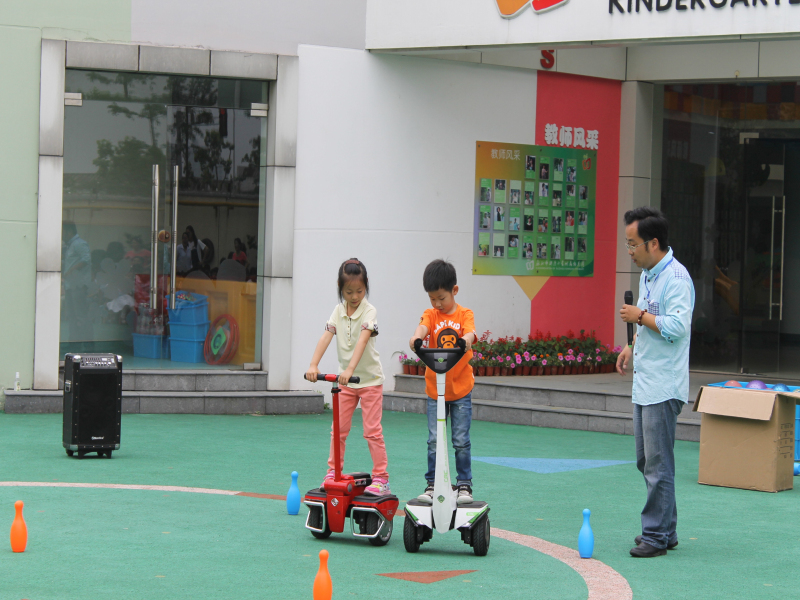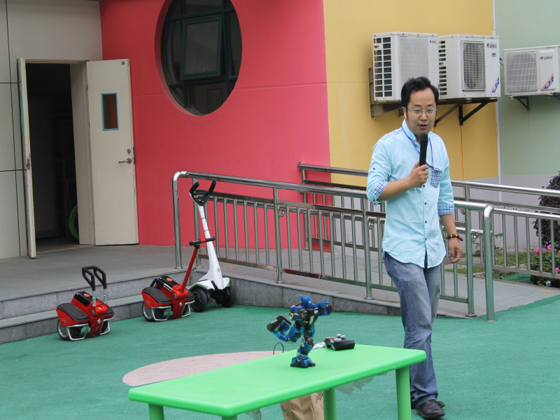 开幕式上来自苏州市教育局的徐暹老师带来了精彩的机器人表演,只见机器人一会儿跳舞,一会儿翻着跟头,又一会儿跟小朋友敬礼……随着机器人灵活的动作表演,科技节活动进入了高潮,孩子们都兴奋地拍着手,尖叫着。紧接着,徐老师向大家普及了关于机器人会跳舞的秘密,孩子们懂得了机器人会动是因为在每个关节处都安装了马达。随后,徐老师又展示了自平衡式机器人,孩子们纷纷站了上去,进行了体验,既开心又紧张刺激,整个操场上不时出现阵阵掌声和加油声。老师们也童心未泯,也参与到了体验的行列之中。
