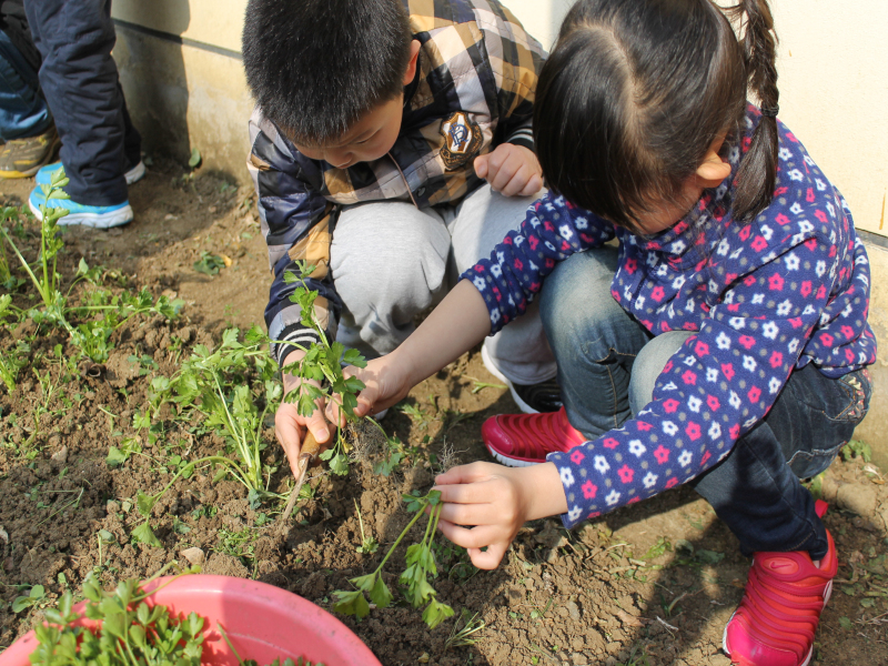 在老师的带领下,孩子们来到了蔬菜园。看!他们纷纷拿起铲子,在蔬菜园种上充满希望的蔬菜苗;在老师的指导下,他们轻轻蹲在蔬菜身旁,用小水壶为蔬菜浇水,拿垃圾袋捡走垃圾,为蔬菜苗创造一个干净的环境,充满爱心的行动表达了他们对植物的爱护和祝福。活动中孩子们兴奋极了,挖坑、填土、浇水……收获种植的辛劳与快乐。