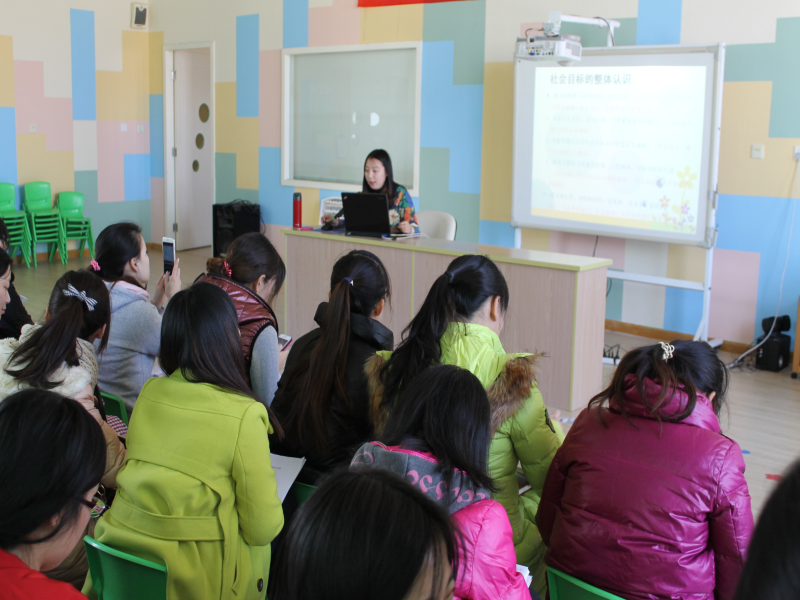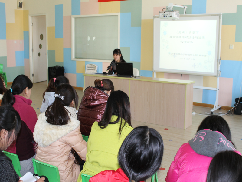 两位老师都是以《指南》为指导精神,把自己从教多年的经验与新教师们进行了分享与交流。王玥老师结合实例,重点交流了在幼儿活动中如何有效地把社会活动融入到多领域的教学中的意义与重要性。而戴吉芳老师则通过自身说课的实际经验和对说课内容的进一步反思,从如何设计社会活动和如何说课两部分,向新教师们传授了说课要点,并亲自现场演绎了整个说课过程,让大家更直观的掌握如何说好一堂课的方法。