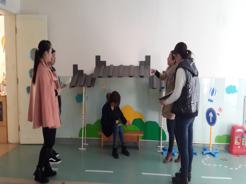 在年级活动的交流中,小班年级组的老师们进行了深入的讨论,根据实际情况提出了很多修改意见。大家认为原本用KT板制作的“公交车站”无法体现苏城古色古香的特色,应该用黑色制作复古屋顶,并且,在车站为幼儿提供等车座椅,让游戏环境跟贴近幼儿的生活。此外,老师们还一起动手整理、增添辅助材料,让原本杂乱无章的建筑工地看上去更美观、整齐!
