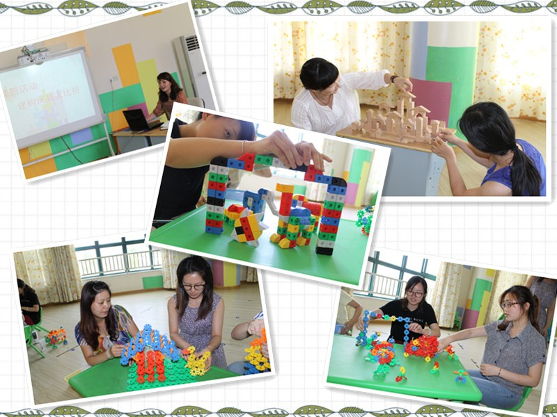 首先,龚老师和大家一起分享了幼儿园几种常见的建构积木,老师们对各种积木的材质、搭建方法开展了积极地讨论。在比赛环节老师们在规定的时间内,充分发挥想象力,利用各种建构积木大显身手,搭建出的玩具造型别致,内容可谓丰富多样:天鹅、娃娃家、双子楼、摩天轮、风车、幼儿园、别墅……