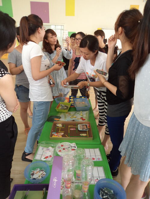 这些科学小制作不仅外形美观、而且玩法多样、趣味性强。如:《会站立的小猫》、《荷花朵朵开》、《有趣的膨胀》、《水的三态》、《跳舞的磁针》等。每个班级的教师对自己的作品进行了详细解说,包括设计的初衷、材料的投放、教玩具的操作玩法及可延续性等,让老师们大开眼界。