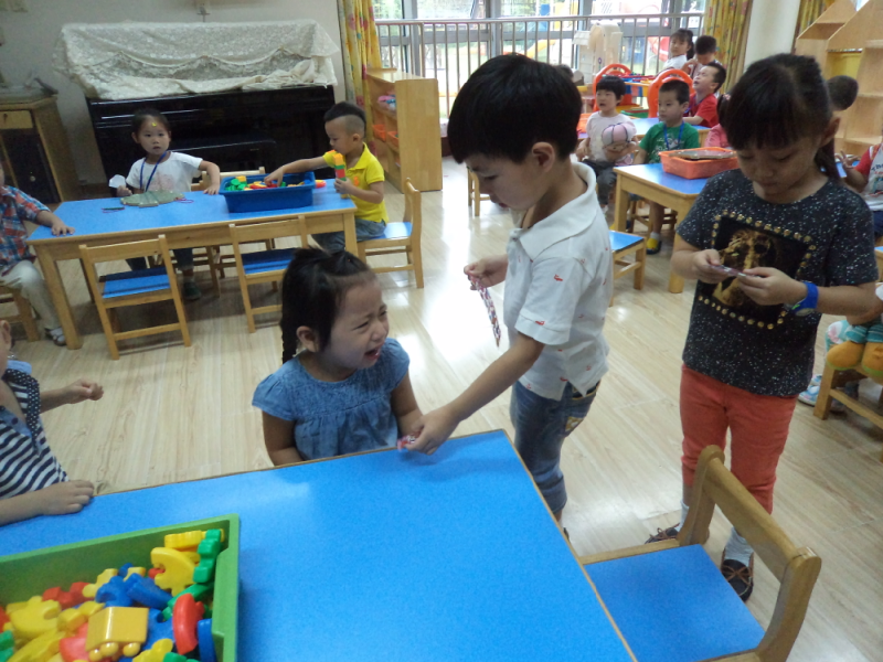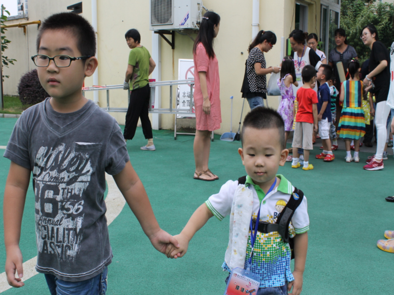 活动前,老师们先把这个特别的任务告诉了大班的孩子们——接送小班弟弟妹妹,顿时爱心在孩子们中间象涟漪一样荡漾开来,个个争先恐后地举起小手争做小小志愿者。你瞧,大班的哥哥姐姐们脸上挂着微笑,轻轻地拉着弟弟妹妹的小手送他们进教室,俨然成了弟弟妹妹的小小“保护伞”。同时,大班的孩子们还手拿着五颜六色的贴纸和糖果送给弟弟妹妹,还对弟弟妹妹说:“幼儿园很好玩,弟弟妹妹别哭了,我们送礼物给你。”……