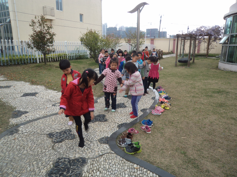 天气暖和了,小朋友也都像春天的小种子一样蠢蠢欲动,迫切的想活动一下。幼儿园的后花园里有一条长长的弯弯曲曲的鹅卵石路,黑白相间非常美丽,让孩子们穿着袜子在鹅卵石上随意地走,体验脚和石子间的触觉,也是一种健身活动。孩子们在走走跑跑中从原来的“痛并快乐着”到后来的“不痛了真好玩”,体验到了坚持、勇敢的精神和乐趣。