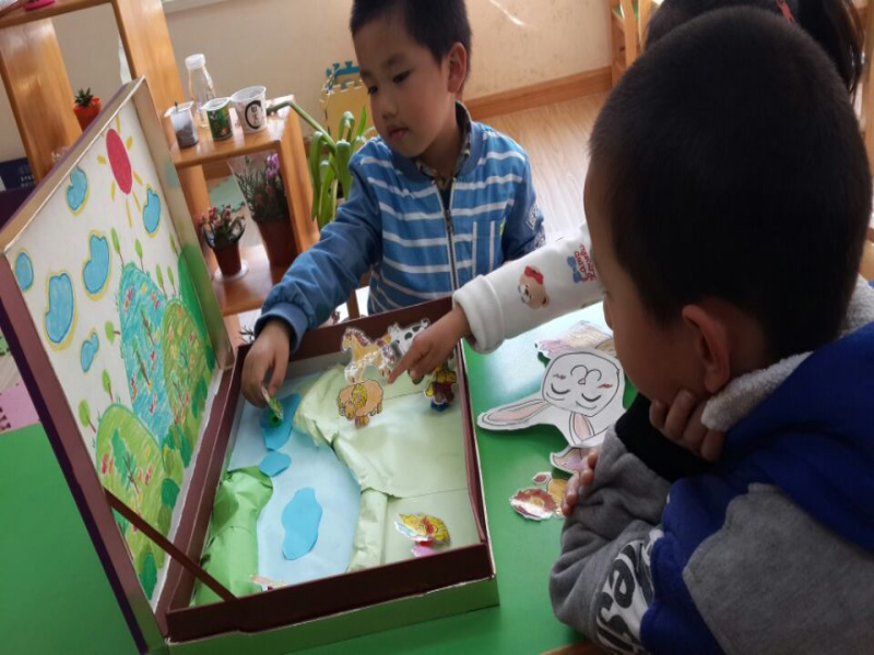“小鸡在草地上捉虫,它遇见了在河里洗澡的小青蛙,它们开心地打招呼……”瞧,可爱的孩子们正在小小的故事盒旁讲着故事,他们有说有笑,十分快乐。