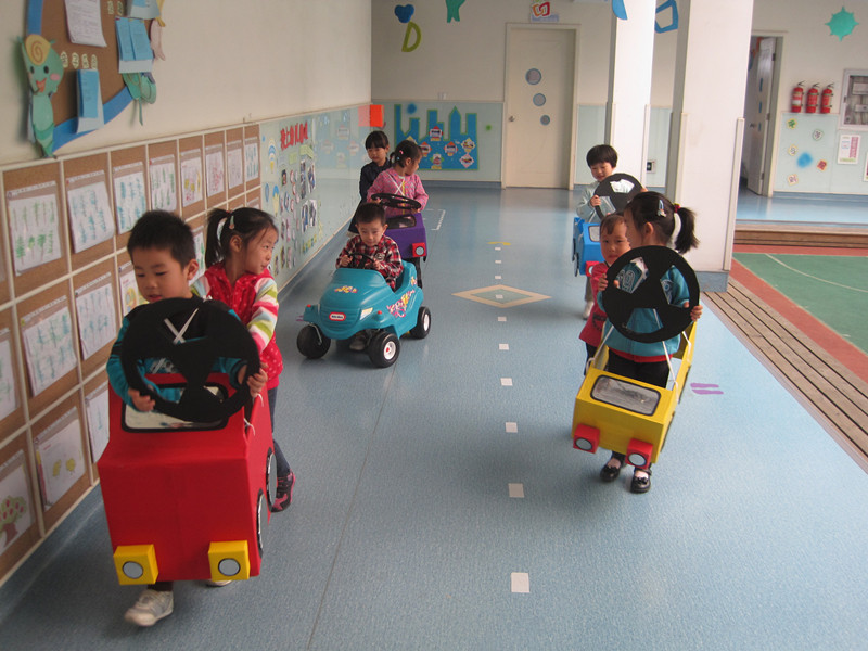 新康小学附属幼儿园小班的老师们,利用废旧材料,结合现实生活,开出了汽车“叭叭叭”的游戏主题。在游戏中幼儿不仅可以开着汽车,还可以去加油、去洗车……,并且通过游戏还了解了一些简单的交通规则,如:红灯停,绿灯行等。
