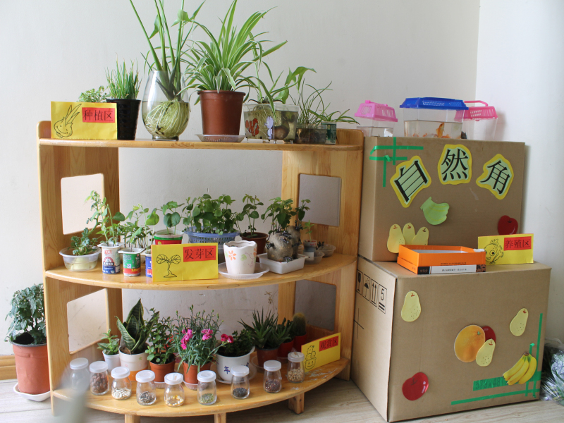 根据幼儿的年龄特点,各班创设了生机盎然,充满活力的自然角。小班的自然角饲养类丰富,螺丝、金鱼、乌龟、蝌蚪等应有尽有,俨然一个生态园;中班种植类品种繁多,富有生命力,每一种类都有明显的标签名称,牢牢吸引了幼儿的视线;大班幼儿和老师一起精心培育的自然角地更丰富了,发芽的豆类、种植的茨菰、饲养的河蚌、蚕宝宝……。在教师的指导下,幼儿学习照料、管理动植物,记录着动植物的生长过程。
