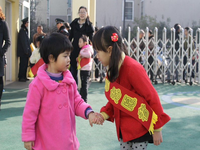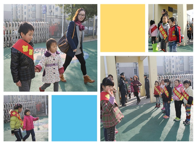瞧,他们排起两条整齐的队伍在幼儿园门口迎接入园的小班孩子们。他们主动拉起弟弟妹妹的小手,亲切地向他们问好、交流,把弟弟妹妹安全的送到班级里。