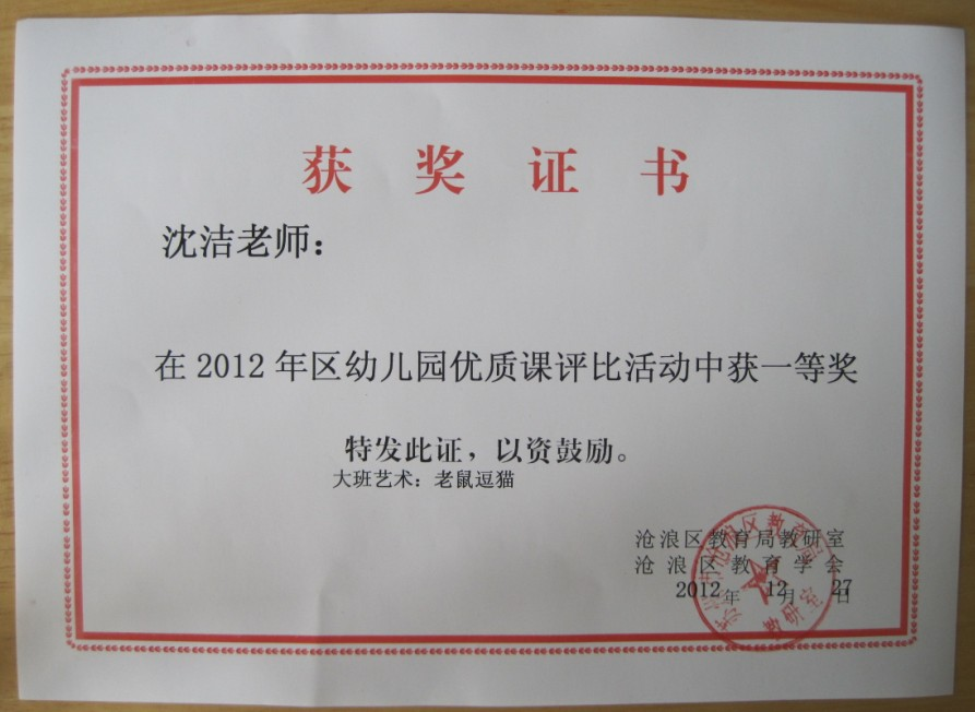 喜报:热烈祝贺我园沈洁老师在2012年区幼儿园优质课评比活动中获得一等奖