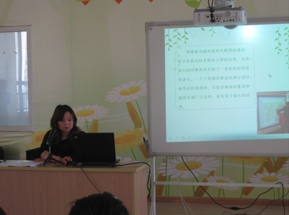 本月11日下午沧浪区语言中心组骨干教师在我园进行了讲座,来自各所幼儿园的50多名教师出席参加。我园何晅园长就电子白板这一新型教学媒体在绘本教学中的运用进行了精彩的讲座。讲座中,何园长结合本园老师制作的几个优秀白板课件,详细讲述了白板特有效果在绘本教学中的生动应用,还亲自示范,向大家展示了“翻页”、“拖拽”、“放大镜”、“聚光灯”等特殊效果。