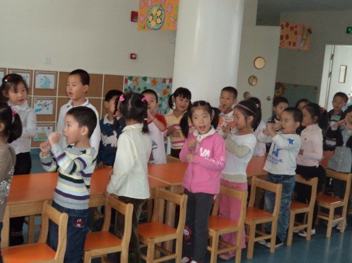 在庆祝活动开始前,幼儿园内就飘扬起了好听的歌曲,孩子们在歌声中,在各班教师的引导下,有秩序地站好,等待神圣而隆重的升旗仪式。