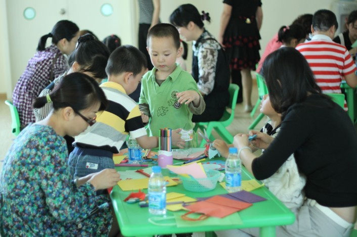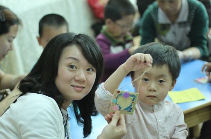 推开一间间教室,老师们为每一个孩子准备了丰富多彩的DIY半成品,孩子们正用灵巧的双手和家长共同制作着精美、个性的礼物。瞧,白色透明的手镯在孩子们自由的描绘和装饰下变得如此五彩斑斓,这是最漂亮的六一礼物;一块黑漆漆的卡片用小木签刮出自己喜爱的图案和文字,再贴上磁铁就是一个独一无二的冰箱贴,放在家里真实用;用彩色的毛线在打好孔的贺卡上随意穿出图形,涂上漂亮颜色,再让妈妈写上一句祝福的话,送一张自己亲手制作的父亲节贺卡爸爸一定很高兴。还有环保纸袋、羽毛风铃、马赛克贴画、DIY灯笼、牛皮纸小镜框等12种简单又有趣的DIY制作让每一个孩子用创意的手描绘着天真烂漫的童年。