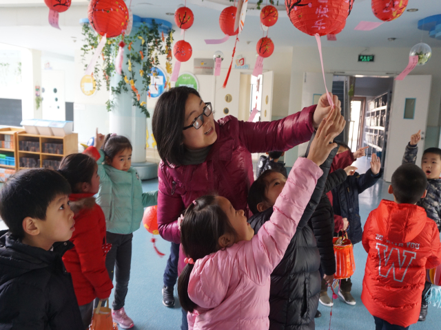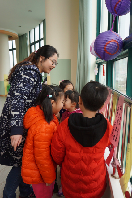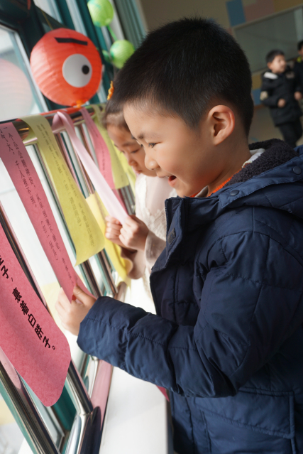 大班此次以“创意”为主题,鼓励幼儿和家长共同参与,动手动脑,运用各种形式制作出元宵节的亲子作品。瞧,红包、纸绳、小木棍等都可以作为制作灯笼的材料;可爱的小狗、吃元宵的场景都成为了创意海报的素材……经过家长和孩子的共同诠释,元宵节的喜庆、祝福变成了一个个富有创意而美好的作品,它们被悬挂、张贴在走廊、教室的各个角落,让我们的幼儿园也变得喜气洋洋,富有活力。活动当天,大班教师还带着幼儿齐聚一楼门厅猜灯谜,孩子们开动脑筋,积极参与,现场氛围欢快又热闹,大家的脸上挂满了快乐的笑容。