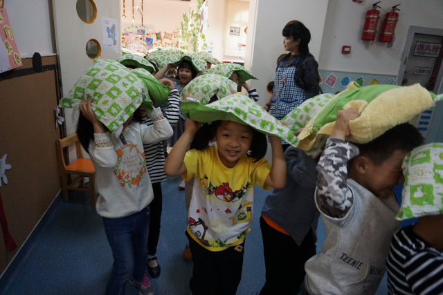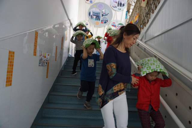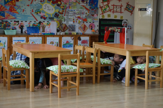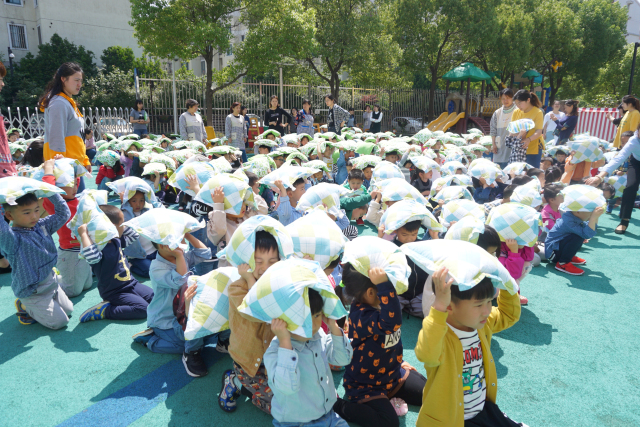 为了使整个活动能安全、有序,每个人能明确自己的职责,活动之前,负责安全的后勤王园长召开了安全会议,沟通协调了各环节的注意事项。上午9时,演练程序启动,警报信号共播放两次,第一次表示地震发生,要求就地避震;第二次表示地震已过,要求各班安全有序撤离。随着第一次警报响起,防震疏散演练正式开始。各班老师立即告知幼儿“地震来了,不要慌”,并指挥幼儿紧急避险。幼儿迅速抱头、闭眼,躲在桌下,尽量蜷曲身体,降低身体重心,并尽可能保护头部,随后一阵急促的防震警报声,各班教师组织幼儿用手或枕头保护头部,迅速有序地分别从安全通道紧急疏散到室外安全空旷场地。