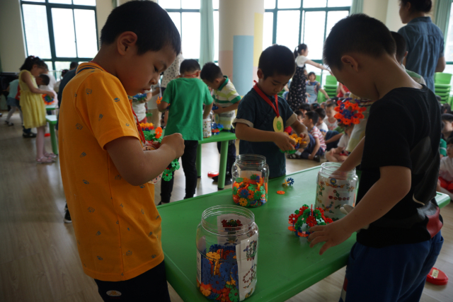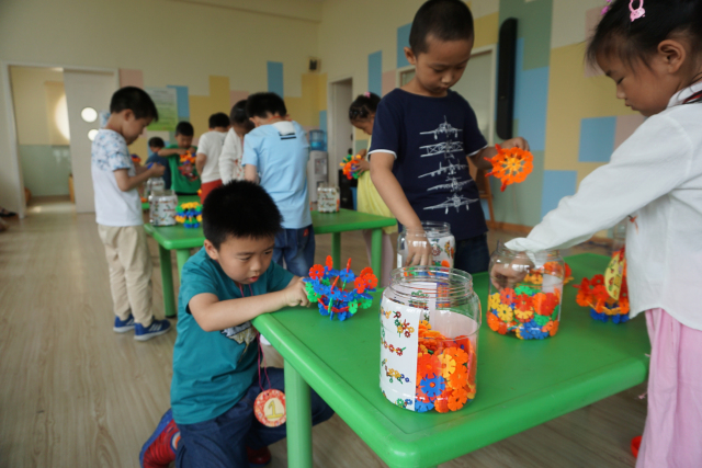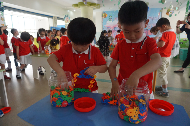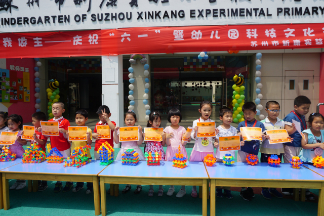 当天,幼儿园正好结合园本乐高科技节举办了开幕式活动,孩子们以“创意花片”为主题,分小、中、大不同年龄段进行了建构大赛。小小的花片积木,通过孩子们创意的想象,灵巧的小手,演变出了一件件建构艺术品。各种各样的汽车、桥的演变过程、未来的宇宙飞船等……一件件作品都是那么的生动、逼真,体现出了较高的建构水平和丰富的想象力。