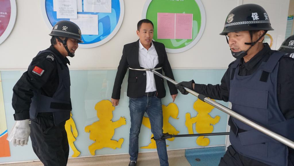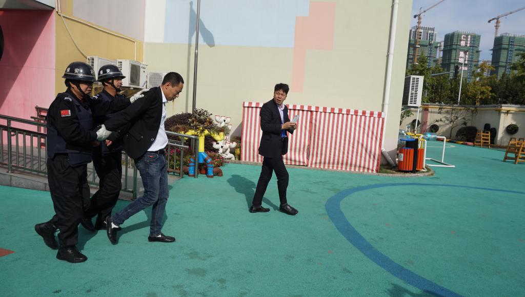 演习开始,扮演的“歹徒”持刀在幼儿园门口寻衅滋事,企图破门而入“行凶”,妄图对教师和幼儿实施暴力侵害。幼儿园第一时间拉起了警报,保安迅速做出反应,使用防暴钢叉、长棍、防暴盾牌、喷雾等设备对“歹徒”进行遏制。与此同时,全体教师立即停止教学工作,马上召集幼儿,提醒幼儿不要慌乱,按照已制定的安全撤离路线有序地撤离现场,到达安全地点后大家迅速关紧教室门窗,防止“歹徒”闯入班级伤害幼儿。老师们在确保安全后,安抚幼儿情绪。