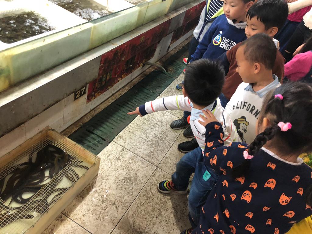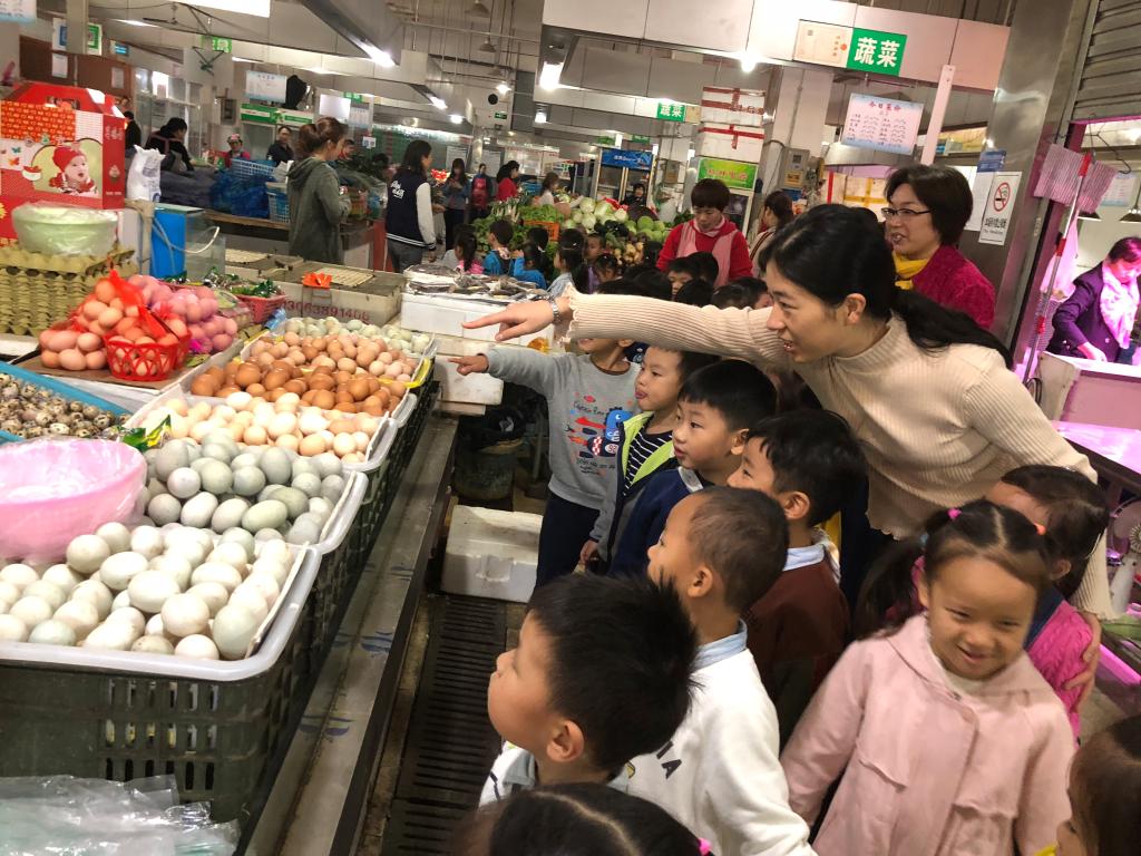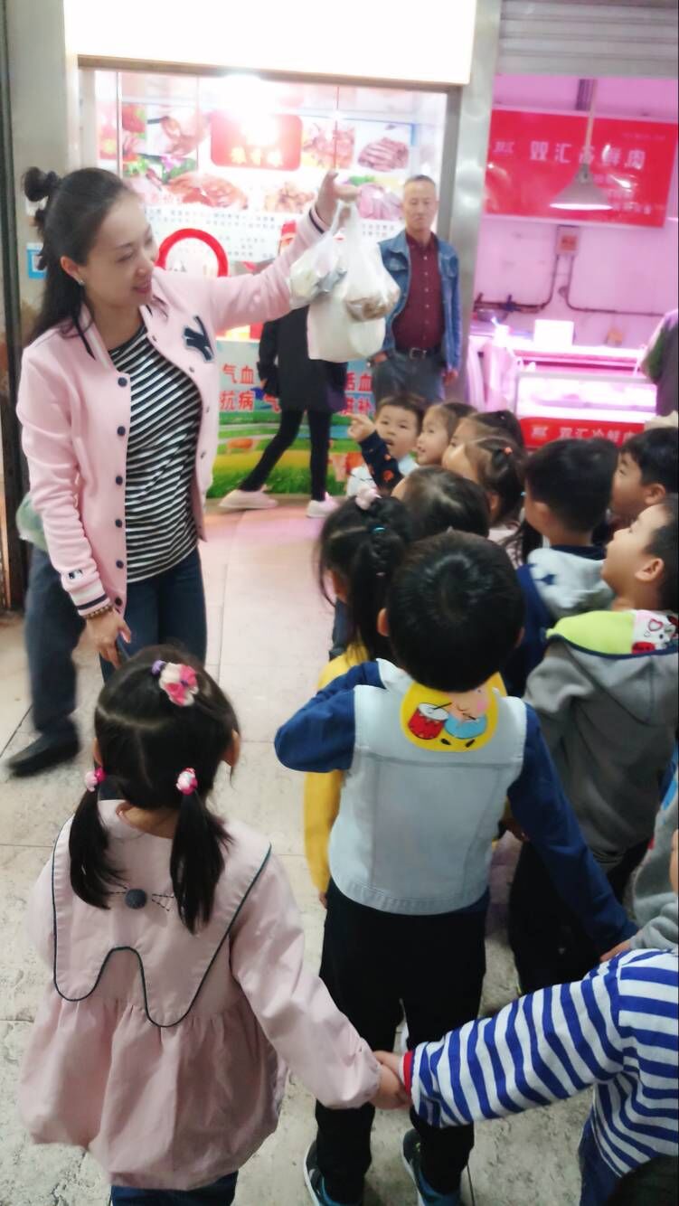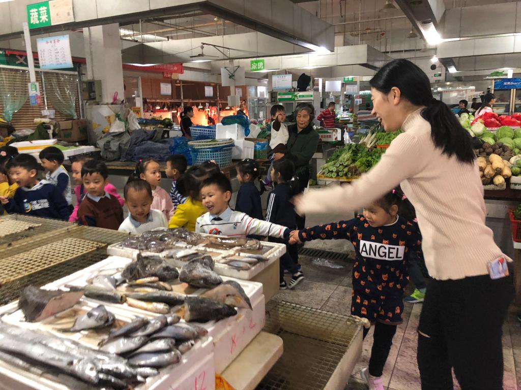 小朋友踏着整齐的步伐,唱着“买菜”的歌曲,在老师的带领下参观了幼儿园附近的新康菜场。菜市场里人来人往、十分热闹,大家一起观察了菜场的各种食品摊位。