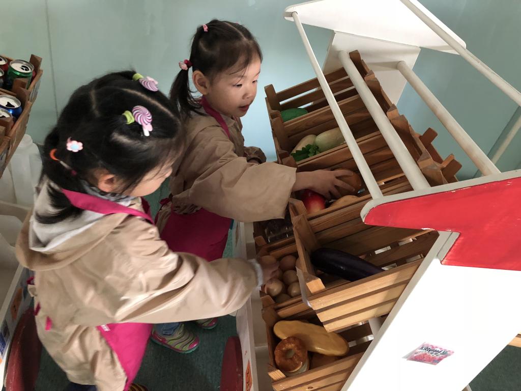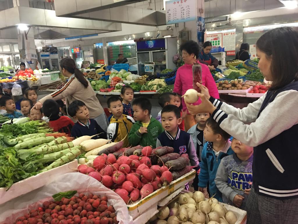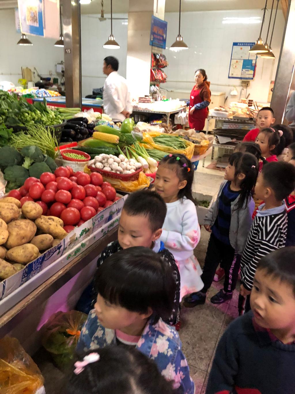 走到了蔬菜区域,孩子们纷纷认出了西红柿、土豆、青菜、萝卜等秋季的蔬菜瓜果,他们穿梭在一排排摊位前,兴奋地指指点点,原来蔬菜都是这么整整齐齐地摆放好,红的绿的,真好看。他们还激动地向身边的伙伴介绍自己喜欢的蔬菜呢。