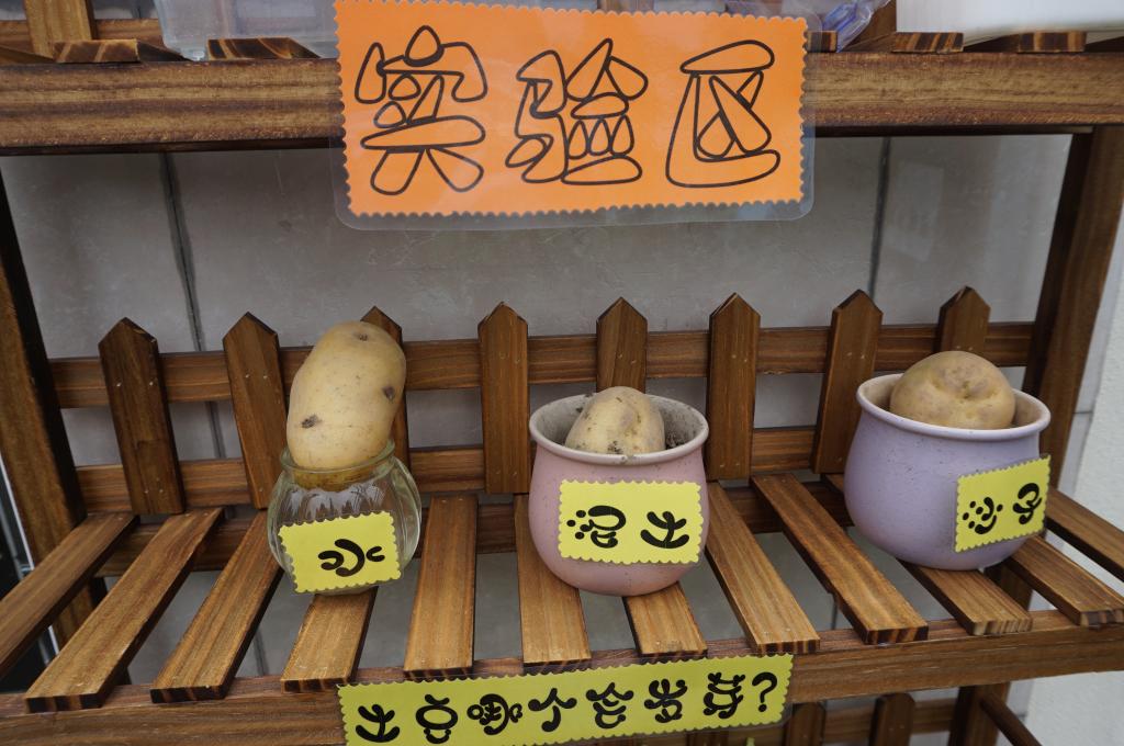 实验区中放的都是宝贝们从家中带来的蔬菜,如:青菜、洋葱、土豆等,把它们进行水培、土培、沙培等对比实验,让孩子们观察在不同条件下植物生长的不同,是不是很有意思呢?