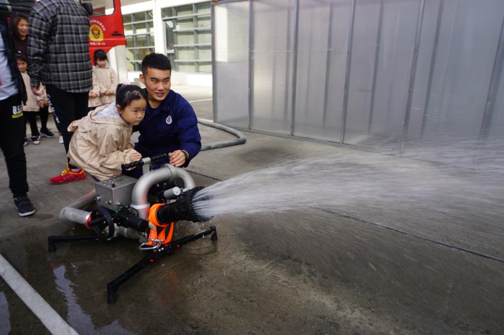 一进消防特勤二队大门,就看到大红色的消防车停在空地上。消防员向大家介绍了消防车辆和随车器材装备,孩子们立刻被这些特殊工具吸引了,有双轮异向切割机、移动照明灯、电动液压钳、机动链锯、高压水枪等装备,这些都是平时消防员抢险救火时必不可少的工具。消防员叔叔还给孩子们演示了用电动遥控消防水炮灭火,由于它流量大,射程远,可随时移动的特点而被广泛使用于消防灭火中。孩子们激动地拍手鼓掌,烈火英雄的形象在孩子们心中更伟岸了。