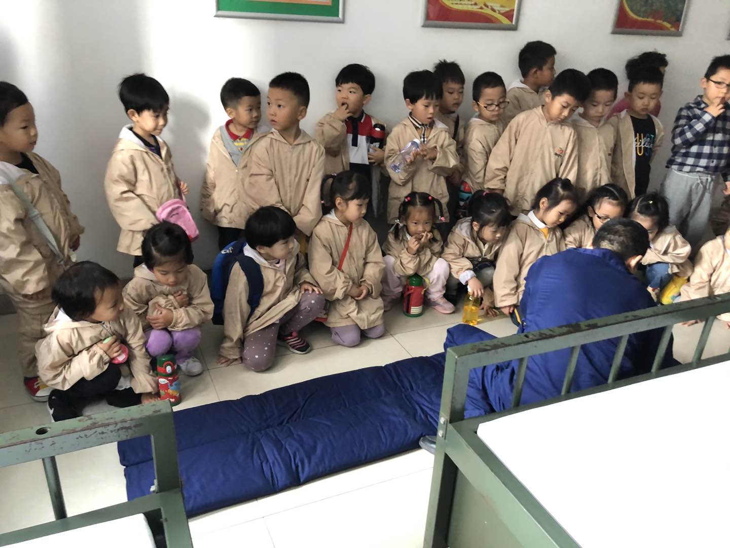 随后孩子们参观了消防员叔叔们的休息室、活动室等,一床床整洁的被子,还有摆放整齐的各类物品,孩子们都忍不住惊叹起来“哇,好整齐哦”。消防员还为孩子们展示了叠被子的“手艺”,幼儿纷纷惊叹道“真像一块大豆腐!”,他们真切的感受到了消防员叔叔做事认真严谨的态度。