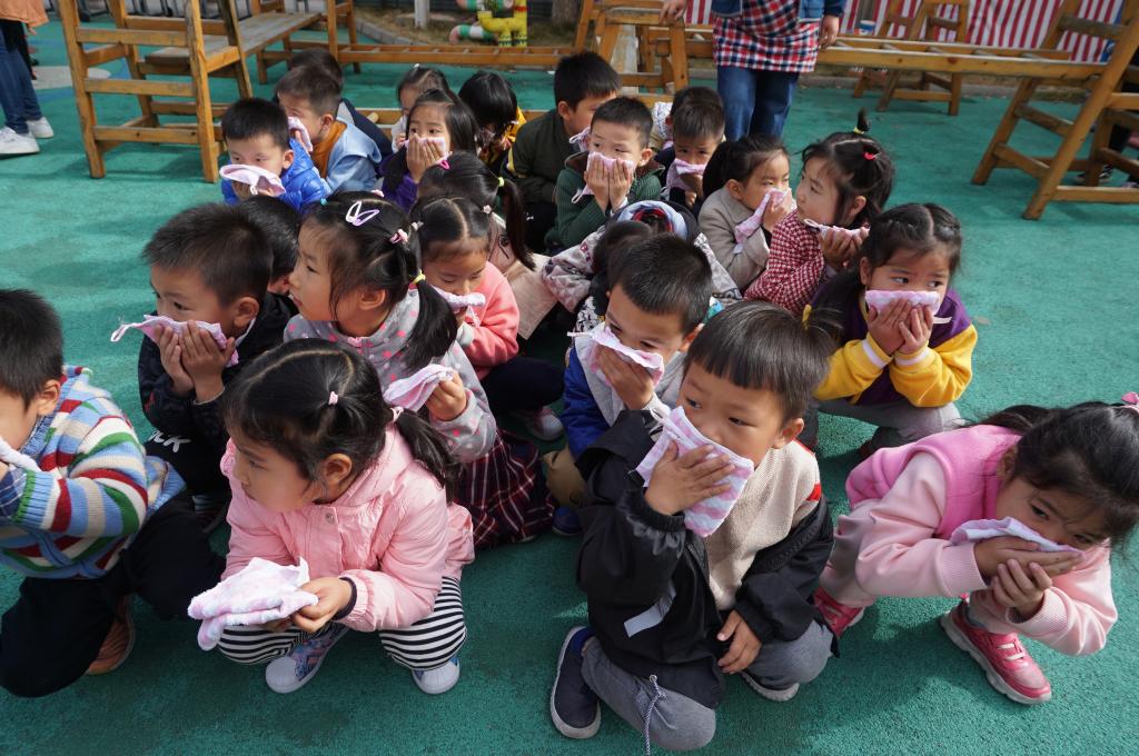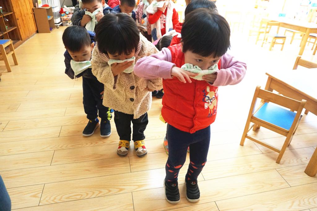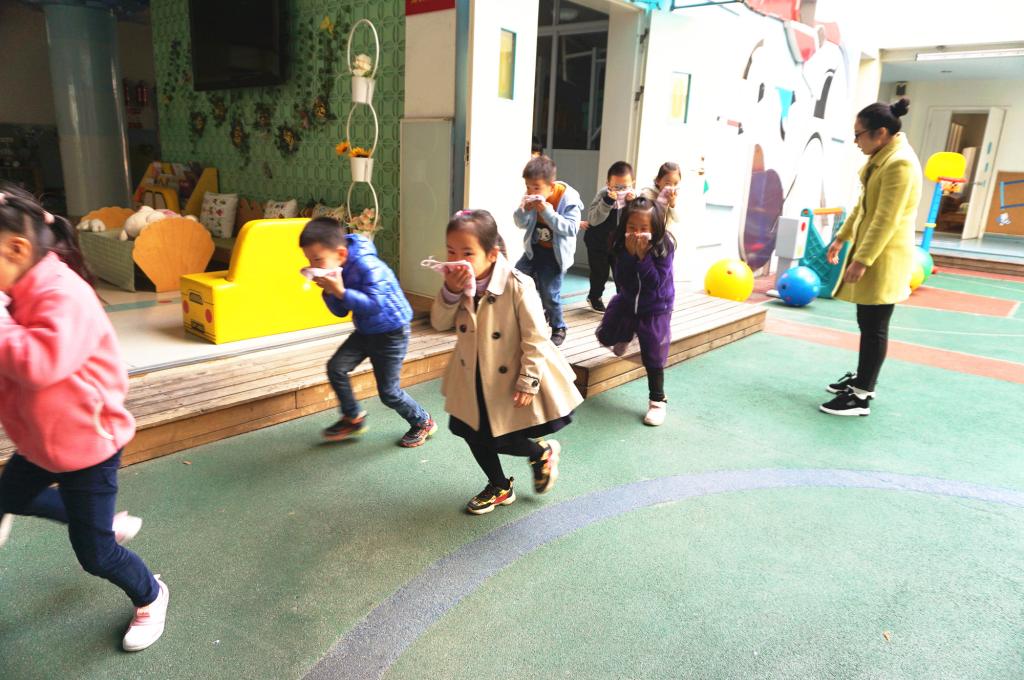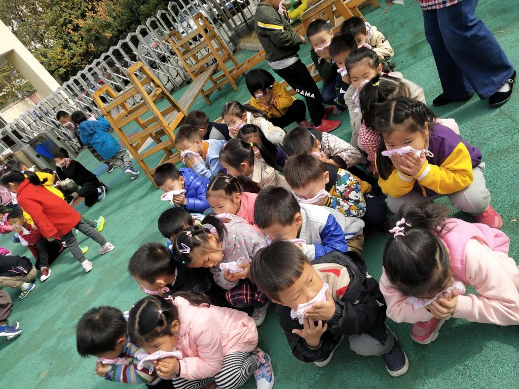 10点15分,警报声响起。小朋友们拿起湿毛巾,捂住口鼻,跟着老师弯腰小步快走,井然有序地按照消防逃生路线来到操场安全地带。