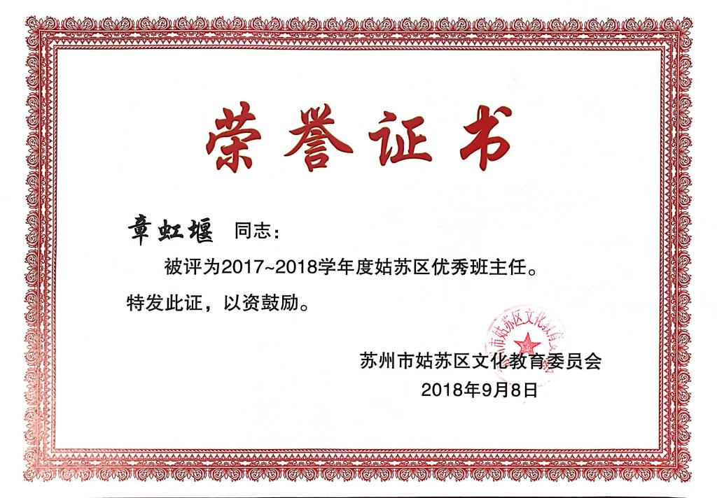 章虹堰老师被评为2017-2018年度姑苏区优秀班主任