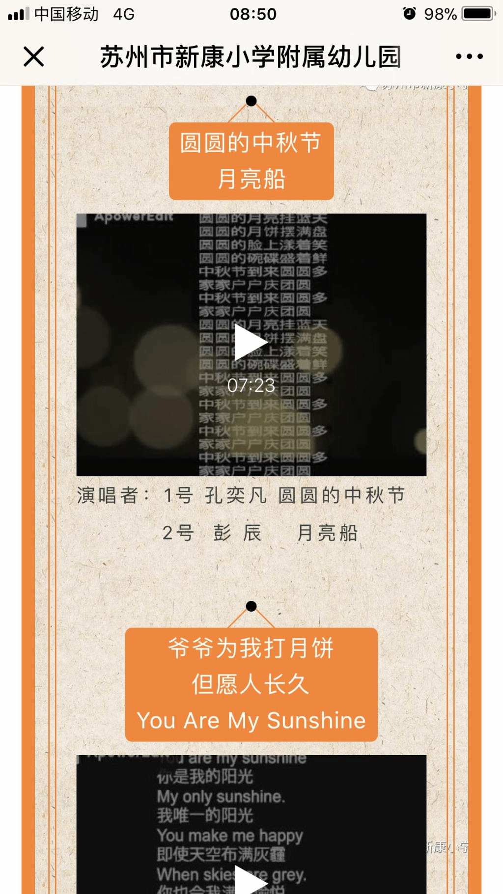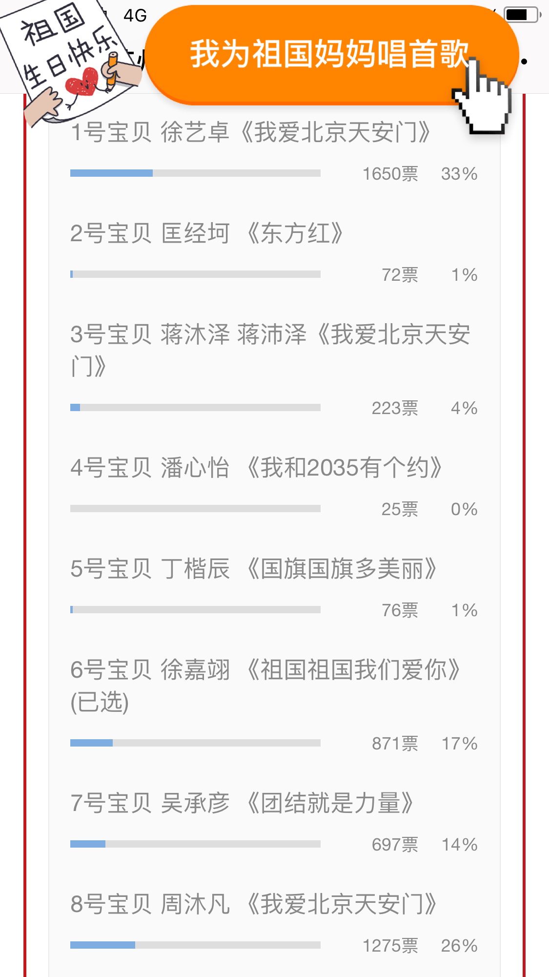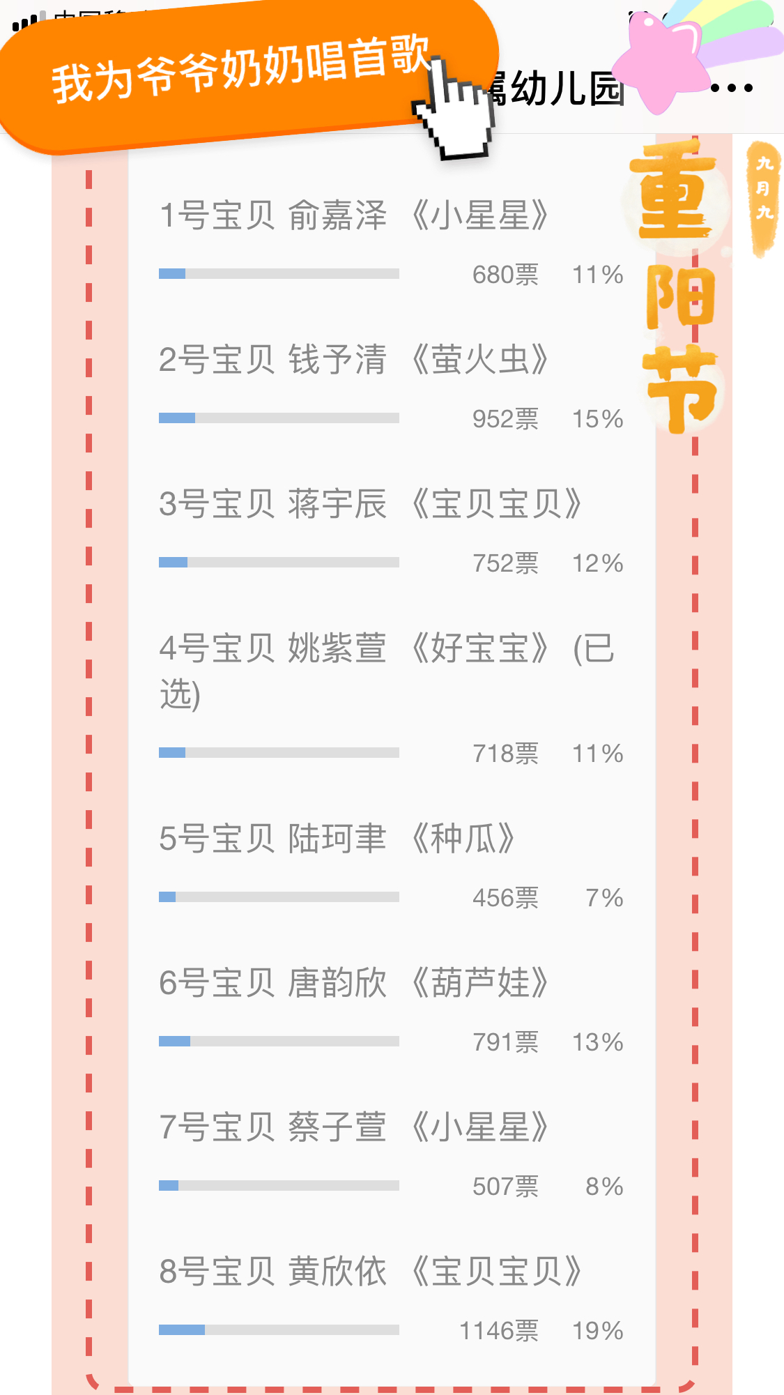 接着,在中秋、国庆、重阳佳节来临之际,幼儿园以“快乐童声唱团圆”“我为祖国妈妈唱首歌”“我为爷爷奶奶唱首歌”为主题分别邀请大中小班孩子表演歌曲并录制视频,以推送微信进行投票的形式,为孩子们的成长留下美丽的足迹。