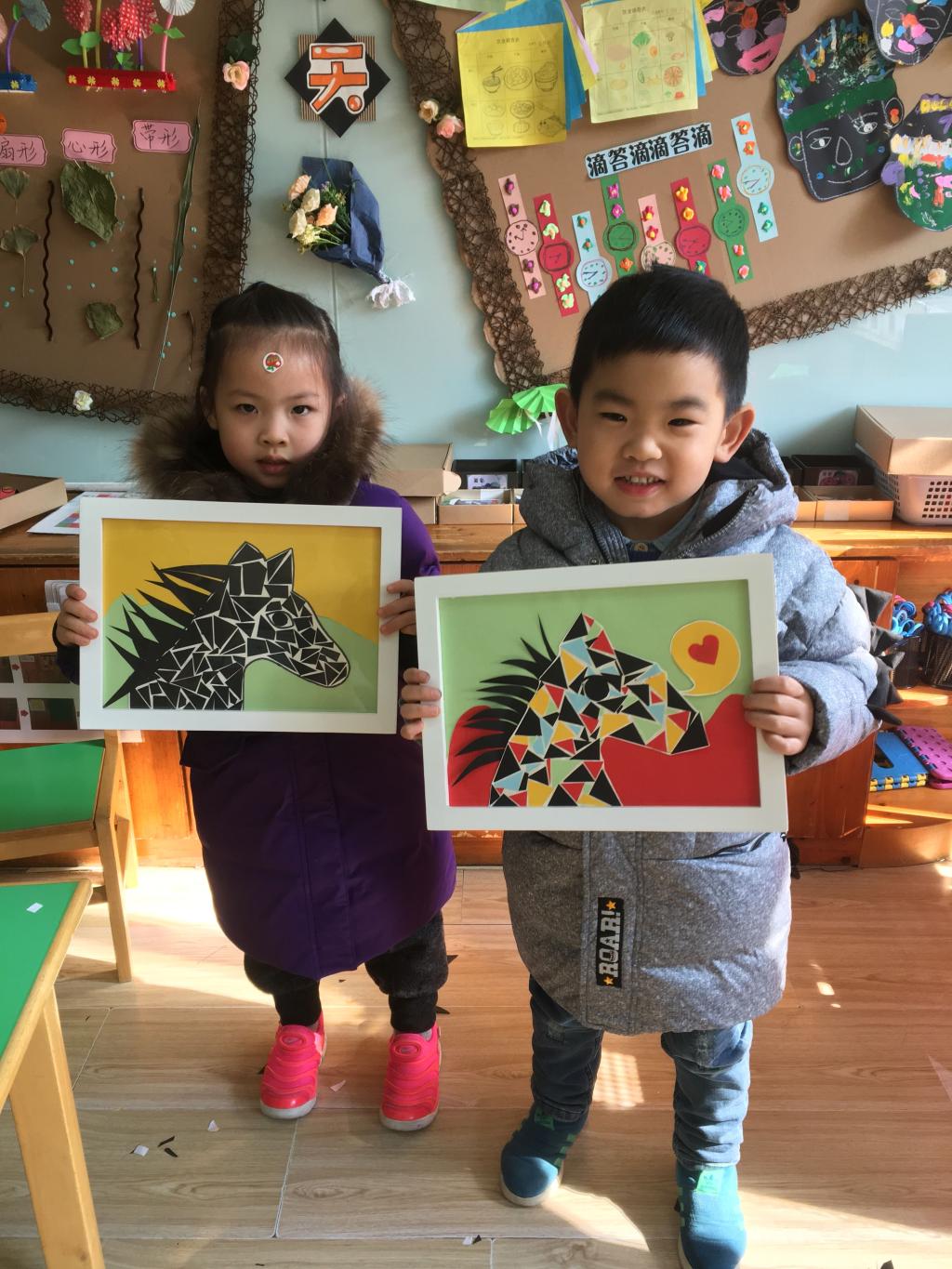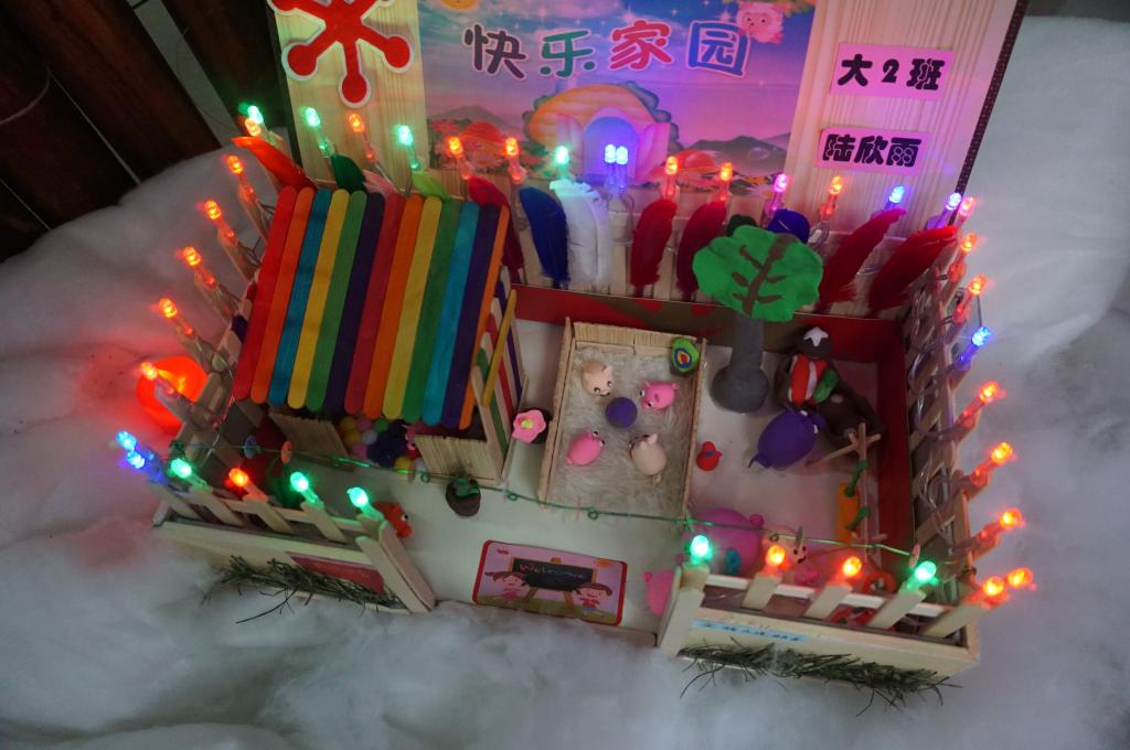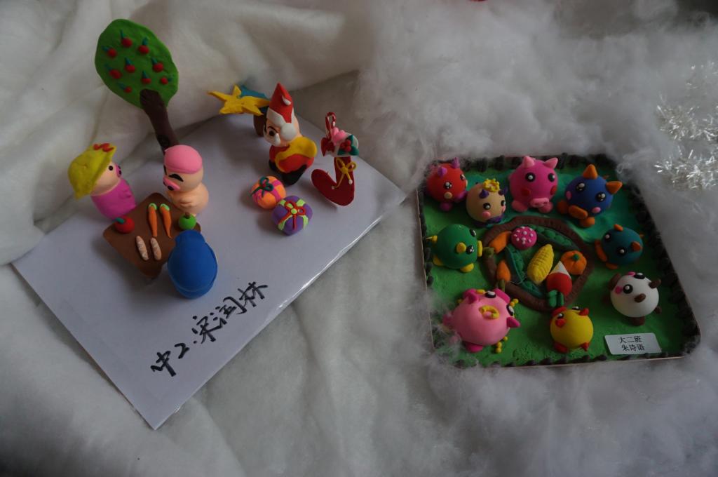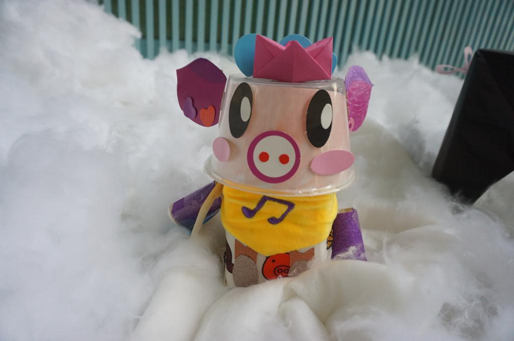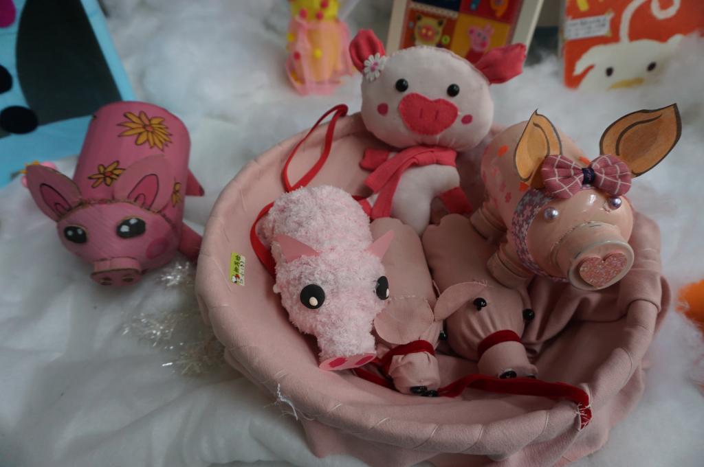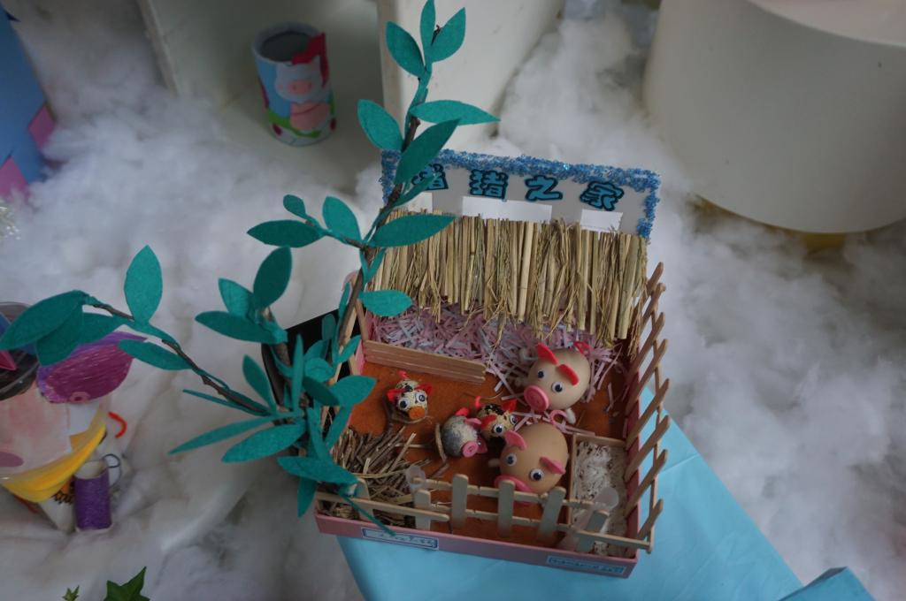 前期,幼儿园邀请家长们利用废旧、环保材料和孩子们一起动手DIY制作“可爱的小猪”。家长们奇思妙想,有的用蛋壳、有的用旧衣服缝制、有的用纸条编织、有的用彩色黏土,各色各样极具创意。