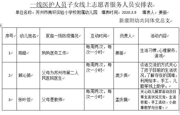 我们身边有许多家长都是来自一线的医护人员,他们为我们负重前行,他们不畏艰险奋勇抗疫,而此刻他们年幼的子女正因父母工作的特殊性使他们缺少了亲人的关怀。新康实小附属幼儿园共同体党总支推出精准有效的一线医护人员子女线上互动活动,提供“一对一”线上游戏课程、心理疏导等帮扶,为一线医护人员子女提供更多关注,因地制宜地开展一些行之有效的教育活动。“爱伴天使行”志愿项目正在进行时,为一线防疫人员提供坚实的后备力量,一起打赢这场防控阻击战。