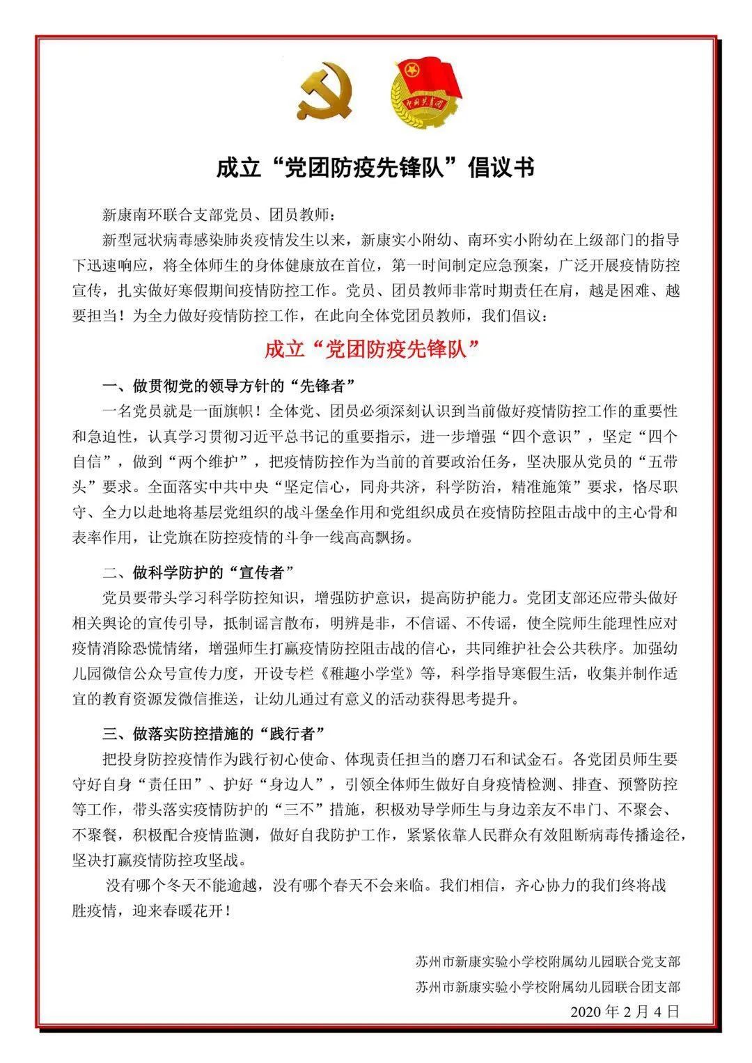 联合党支部全体党员带头做科学防护的“宣传者”、做落实防控措施的“践行者”。在党支部的引领下,党团成立“党团防疫先锋队”,向全体教师发出防疫抗疫的号召。